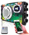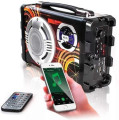 A caixa de som portátil é capaz de tocar as músicas de formato MP3 de cartões SD/MMS ou USB, além de funcionar também como rádio FM. Possui função bluethooth que permite controlar o aparelho à distância. Funciona também como um amplificador de som de altíssima qualidade e potência, permitindo seu uso em nas mais diversas situações, seja em reuniões de lazer ou como instrumento para divulgação de produtos e/ou campanhas. Bateria de bom desempenho e duração.