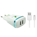 Carregador de parede ultrarápido com capacidade de 3.1A, conector USB Tipo C e duas entradas USB, permitindo a recarga de até dois aparelhos simultâneamente.