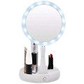Dobra e gira para fácil utilização e armazenamento. O LED super brilhante acende-se em ambos os lados para iluminação perfeita da imagem. É feito de vidro isento de distorção. Possui um organizador embutido para acessórios. É leve e compacto para viagens. Espelho com funcionamento a base de 4 pilhas AA. (NÃO INCLUSAS)